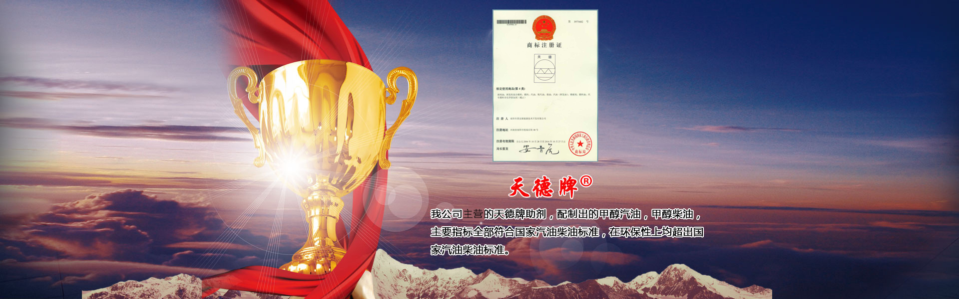 本公司主要產(chǎn)品有甲醇汽油添加劑、甲醇柴油添加劑、車用復(fù)合柴油添加劑、甲醇燃料油添加劑以及雙燃料控制器和油罐除水劑六大系列九種產(chǎn)品,具有廣闊的市場(chǎng)空間和經(jīng)濟(jì)效益。其中添加劑系列已在國(guó)家商標(biāo)局注冊(cè)為“天德牌”,天德牌問(wèn)世二十多年來(lái),在保證產(chǎn)品質(zhì)量的同時(shí),給廣大客戶帶來(lái)了可觀的經(jīng)濟(jì)利益,得到廣大油品行業(yè)用戶的一致好評(píng)…… 了解更多+